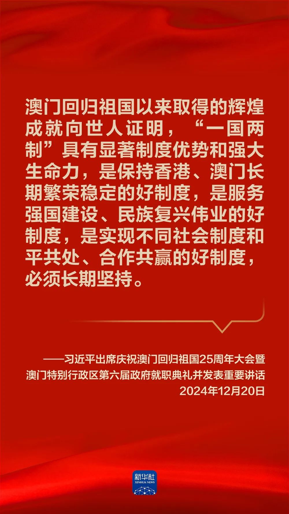 庆祝澳门回归祖国25周年大会暨澳门特别行政区第六届政府就职典礼20日上午在澳门东亚运动会体育馆隆重举行。中共中央总书记、国家主席、中央军委主席习近平出席并发表重要讲话。一起来看讲话金句——
