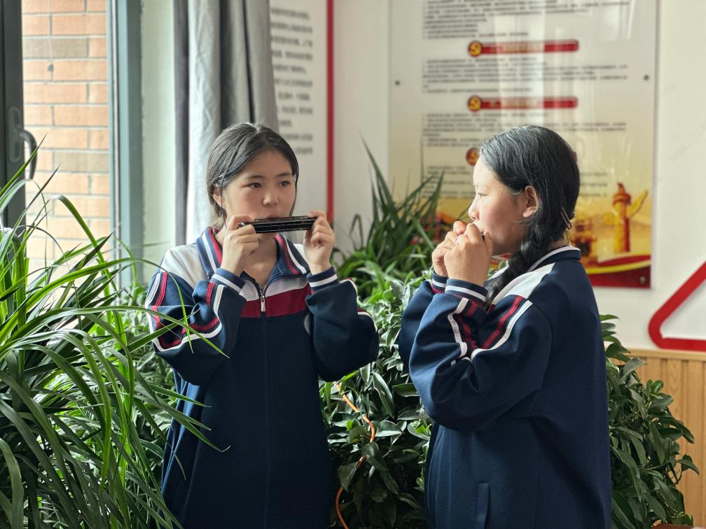 5月30日,果洛西宁民族中学学生闹拉(右)和同学在练习口琴吹奏。新华社记者 张子琪 摄