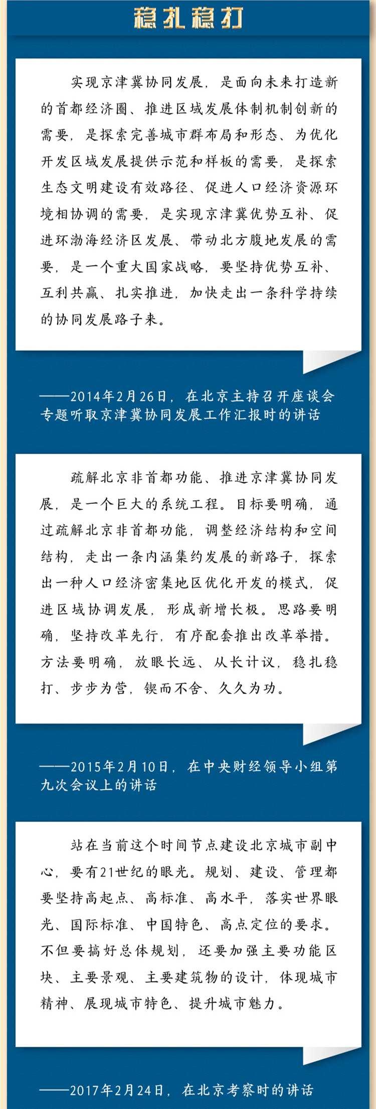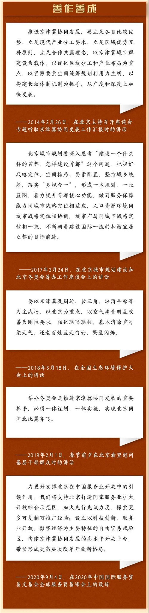 京津冀山同脉、水同源、人相亲、地相连,原本就是“一家人”。7年前,习近平总书记站在中国版图前去审视这片广袤大地,作出将“京津冀协同发展”上升为国家战略的重大部署,要求三地“自觉打破自家‘一亩三分地’的思维定式,抱成团朝着顶层设计的目标一起做”。“京津冀协同发展是一个系统工程,不可能一蹴而就,要做好长期作战的思想准备。”“要从全局的高度和更长远的考虑来认识和做好京津冀协同发展工作,增强协同发展的自觉性、主动性、创造性,保持历史耐心和战略定力,稳扎稳打,勇于担当,敢于创新,善作善成,下更大气力推动京津冀协同发展取得新的更大进展。”............7年来,一趟趟调研、一次次论证,总书记跳出“一城一地”得失来思考发展路径,从国家发展全局的高度去擘画和推动,为京津冀协同发展指明方向。如今,京津冀从各自为政、各管一摊,到相互扶持、彼此协助;从发展战略不清、功能重叠,到优势互补、统筹布局……“一加一大于二、一加二大于三的效果”日渐显现。2021年是“十四五”规划开局之年,如何促进京津冀携手下好“一盘棋”,推动京津冀协同发展迈向更高水平?本文特梳理总书记相关讲话要点,与您一起学习。
