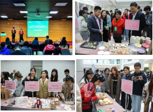 开幕式后,竞赛作品评审答辩和作品展示同步开展。竞赛环节在敏学楼3楼报告厅进行,参赛学生通过PPT阐述产品的创新特色、工艺流程、包装设计和市场分析等,并提供品评,评委针对每组产品的创意及制作流程提出问题和建议。作品展示在敏学楼一楼大厅进行,各高校美食作品和天津市本地食品企业产品共百余件在现场集中展示,吸引了近千名师生驻足品评,现场气氛活跃。活动还进行了“思源·珍惜粮食我示范”环节,倡议全体食品专业的同学立足专业,传承勤俭节约优良传统、弘扬爱粮惜粮节粮美德,同心夯实粮食安全根基的自觉性、主动性和责任感,做节约粮食、倡导粮食安全的践行者、宣传者、推动者、示范者。