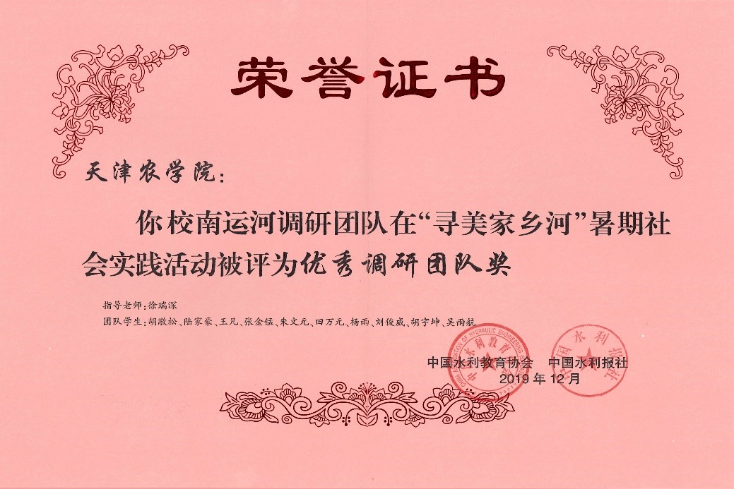学院全体教师积极思考发挥专业课协同教育效应,汇聚育人合力,实现课内课外相结合、线上线下相结合、显性教育与隐性教育相结合的专业课思政教学。自首届天津市新时代·实践行活动开展以来,已经连续四届获得市级先进集体标兵荣誉称号,曾获天津市“三下乡”社会实践活动优秀团队称号。学院寻美家乡河南运河调研队被中国水利教育协会和中国水利报社评选为优秀调研团队。