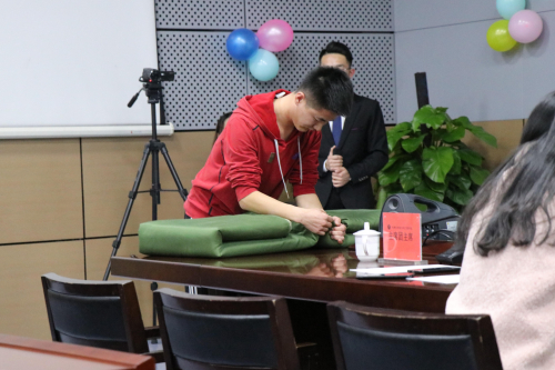 本次活动还邀请了退伍回校的18水电1班学生张卫东,详细为在场同学讲解部队的内务要求,现场为同学们演示叠被子。他娴熟的动作以及叠出的“豆腐块”,赢得了在场同学的掌声。