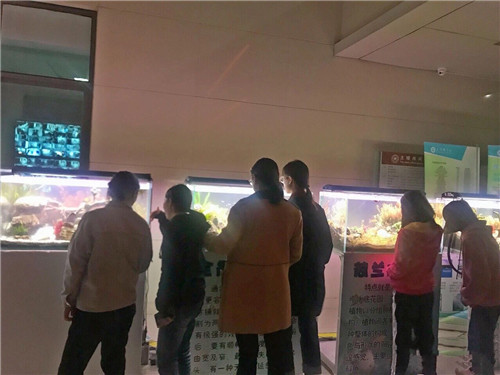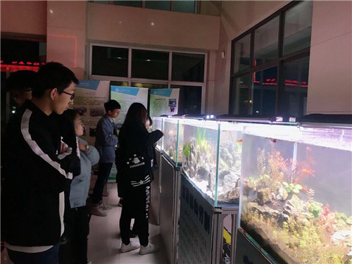 10月23日上午,第三届校园文化节正式开幕后,进入主楼大厅,左手边首先映入眼帘的是六组风格各异的造景水族箱,这是由水族专业学生在专业老师的指导下完成的水族造景作品。从第一届校园文化节开始,就作为展示项目保留至今。在丰富大学生课余活动的同时,促进多学科的交流,把渔业文化与艺术文化、园林文化相结合,激发大学生对学习和创作的兴趣,提高学生的团队意识,增强团队组织能力,并强化学生的实践动手能力和创作能力,唤起学生用劳动创造价值的热情,起到了良好的“美育”效果。