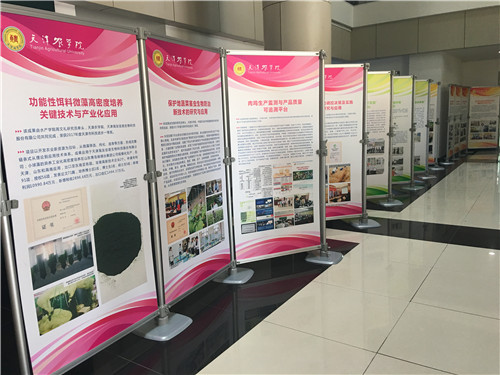 在展板展示部分,主要包括科研创新平台、创新团队介绍,获得省部级科技进步奖的科研成果,已产业化或具有产业化前景的科研成果,在本领域内具有领先水平的科研成果或具有应用特色的科研成果等。共设68块展板,包括6项获省部级以上科研成果,5个“十三五天津市高等学校创新团队”,4个天津市国际科技合作联合研究中心,1个天津市教委人文社科基地,46位市农委新一轮帮扶专家风采,6位市科委新入选的优秀科技特派员。集中展示了学校在科技发展中贯彻落实党的十九大精神,紧密对标国家发展战略,学校教师在科技创新、服务区域经济社会发展方面所做的努力和所取得的成果。