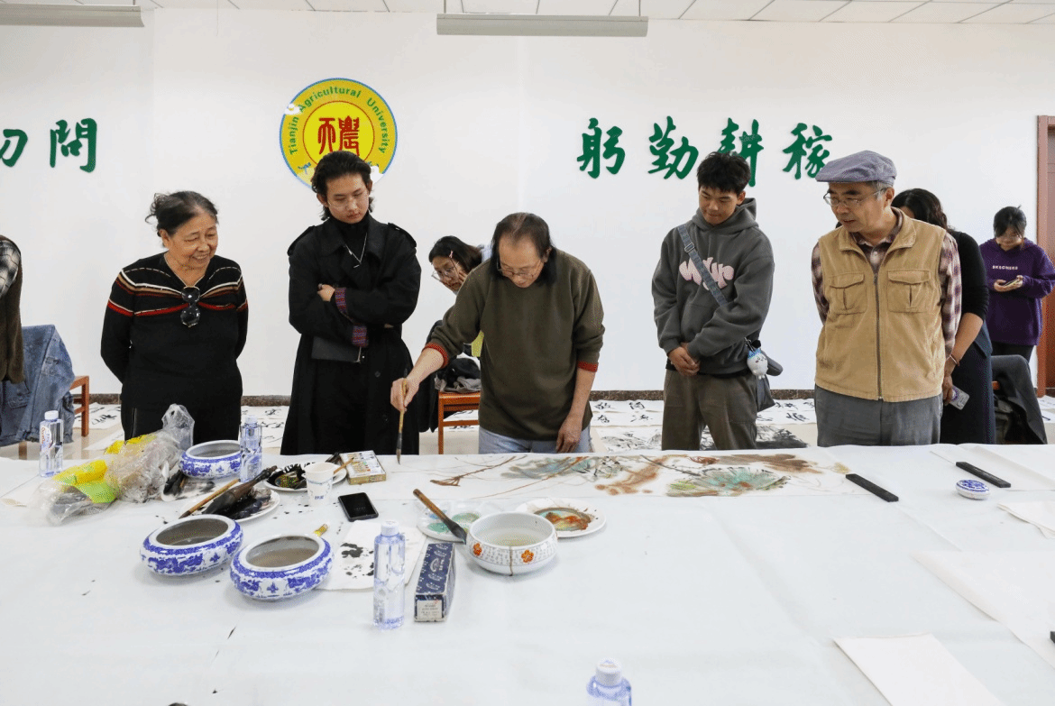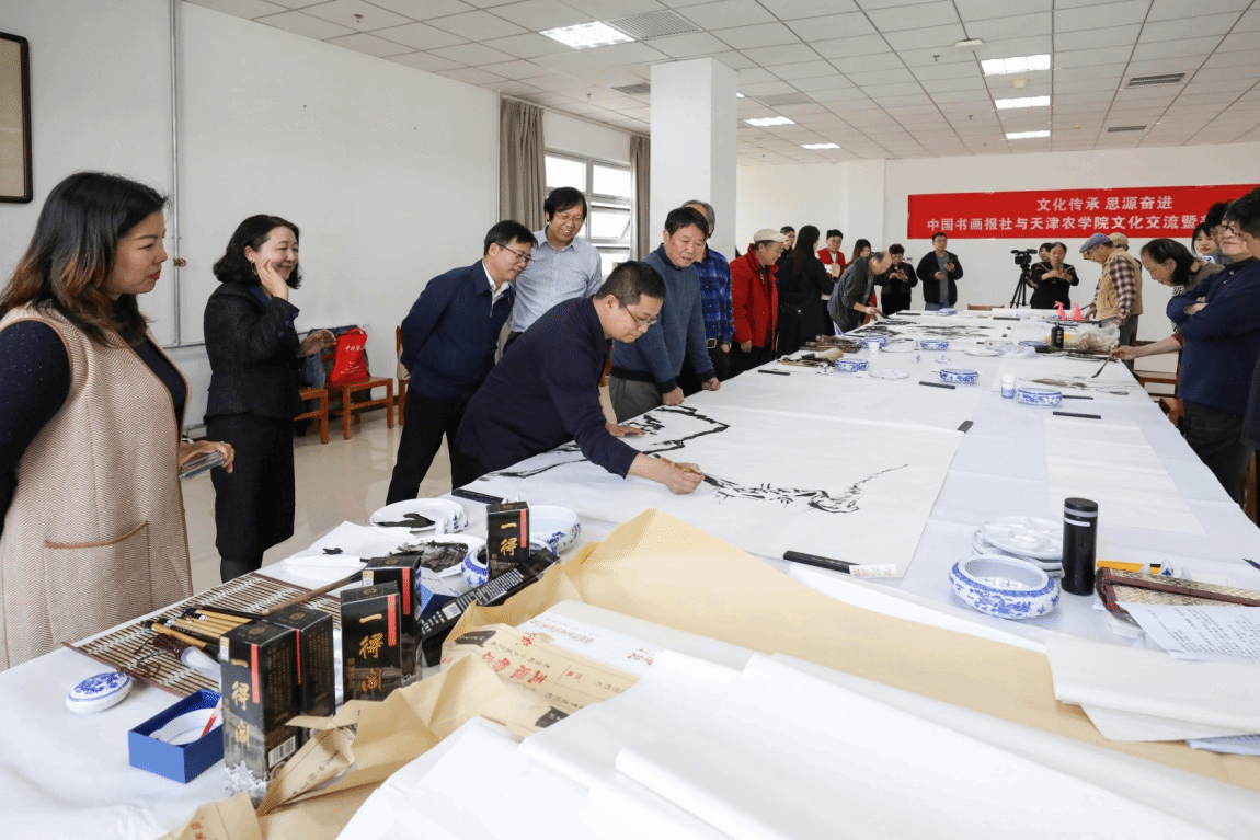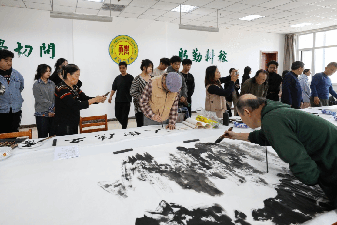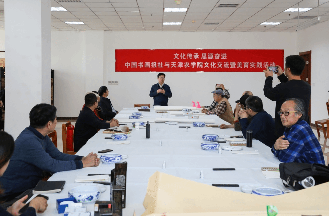 校党委书记李鑫致欢迎辞,他表示,非常感谢各位艺术家能够莅临学校进行笔会活动,此次活动是落实党的二十届三中全会精神、全国教育大会精神和贯彻落实习近平总书记视察天津时提出的“四个善作善成”重要要求,进一步推动文化传承发展,构建“三全”育人、“五育”并举大思政工作格局的重要举措,是开展大学生美育教育实践的重要内容,希望通过此次活动能够进一步丰富学校“思源·奋进”文化,进一步弘扬天农精神,打造自觉、自省、自律、自查、自纠的质量文化,提升天农师生的美育水平,达到以文化人的活动效果。
