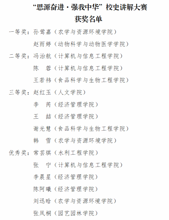 为充分发挥校史文化育人功能,推进爱党爱国爱农爱校教育,近日,“思源奋进·强我中华”校史讲解大赛在今年会官网校史馆举行,共有16名选手进入决赛。