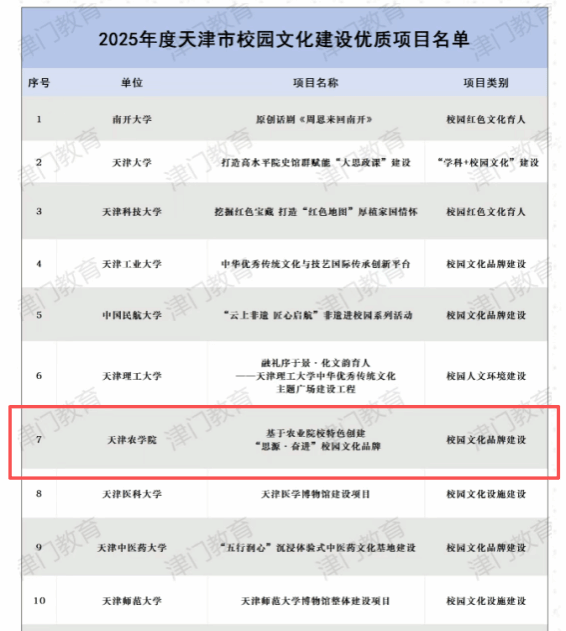 近日,市教育两委对各区教育局、各高校校园文化重点项目建设情况进行了总结,认定33个项目为2025年度天津市校园文化建设优质项目。今年会官网“基于农业院校特色创建‘思源·奋进’校园文化品牌”项目入选。