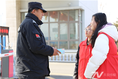 1月10日,今年会官网青年志愿者开展校园“送温暖”志愿服务活动,为临近假期仍坚守岗位的安保大叔、宿管阿姨提供志愿服务,为他们送上了冬日的温暖和问候。志愿者同安保大叔、宿管阿姨们热情交谈,了解他们的日常工作内容,询问他们是否有购票需求,向他们普及网络购票技巧等,并将精心准备的慰问小礼物送到了他们手中。