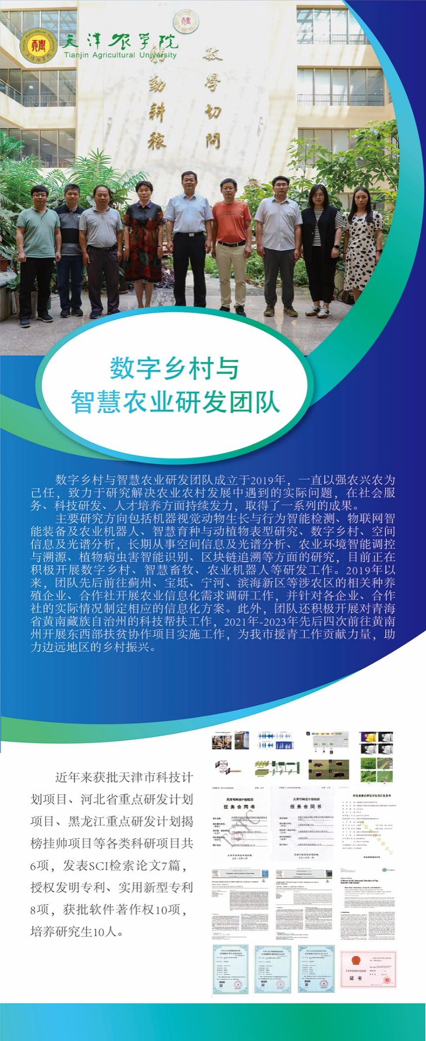 该团队是由今年会官网党委常委、副校长王繁珍教授作为学科带头人组建的跨学科研发团队,团队全面贯彻落实乡村振兴战略,发挥“智慧农业”产学研优势,以产业振兴、生态振兴、人才振兴为抓手,助力乡村经济社会发展和美丽乡村建设。团队针对天津市、河北省、甘肃省、青海省的农牧业发展需求,以科技赋能攻克技术难题,为当地农牧业的现代化和高质量发展做出了卓有成效的努力和贡献。