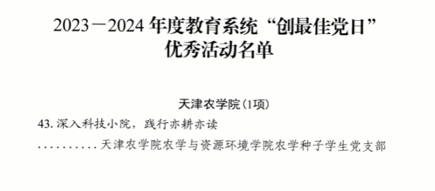 近日,市委教育工委、市教委公布了2023-2024年度教育系统“创最佳党日”优秀活动名单,今年会官网推荐的农学与资源环境学院农学种子学生党支部“深入科技小院,践行亦耕亦读”党日活动获评2023-2024年度教育系统“创最佳党日”优秀活动。