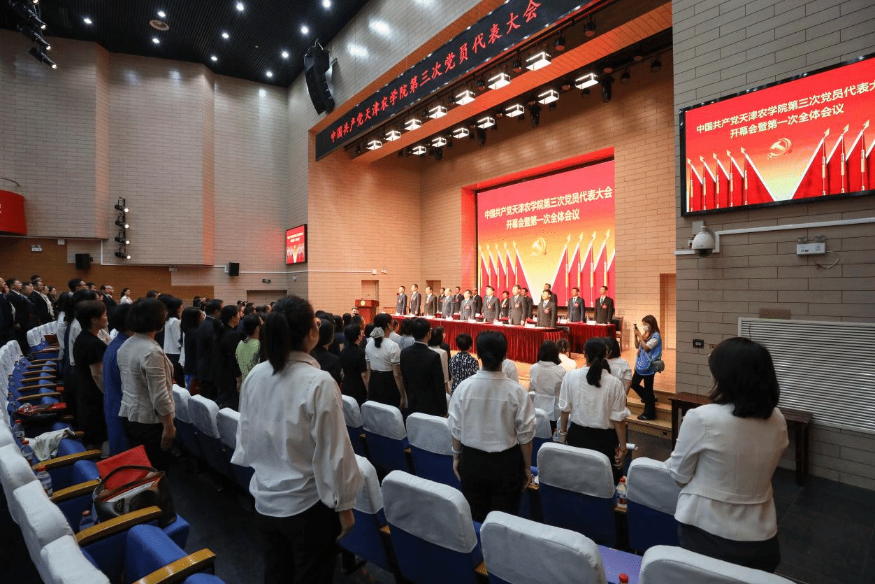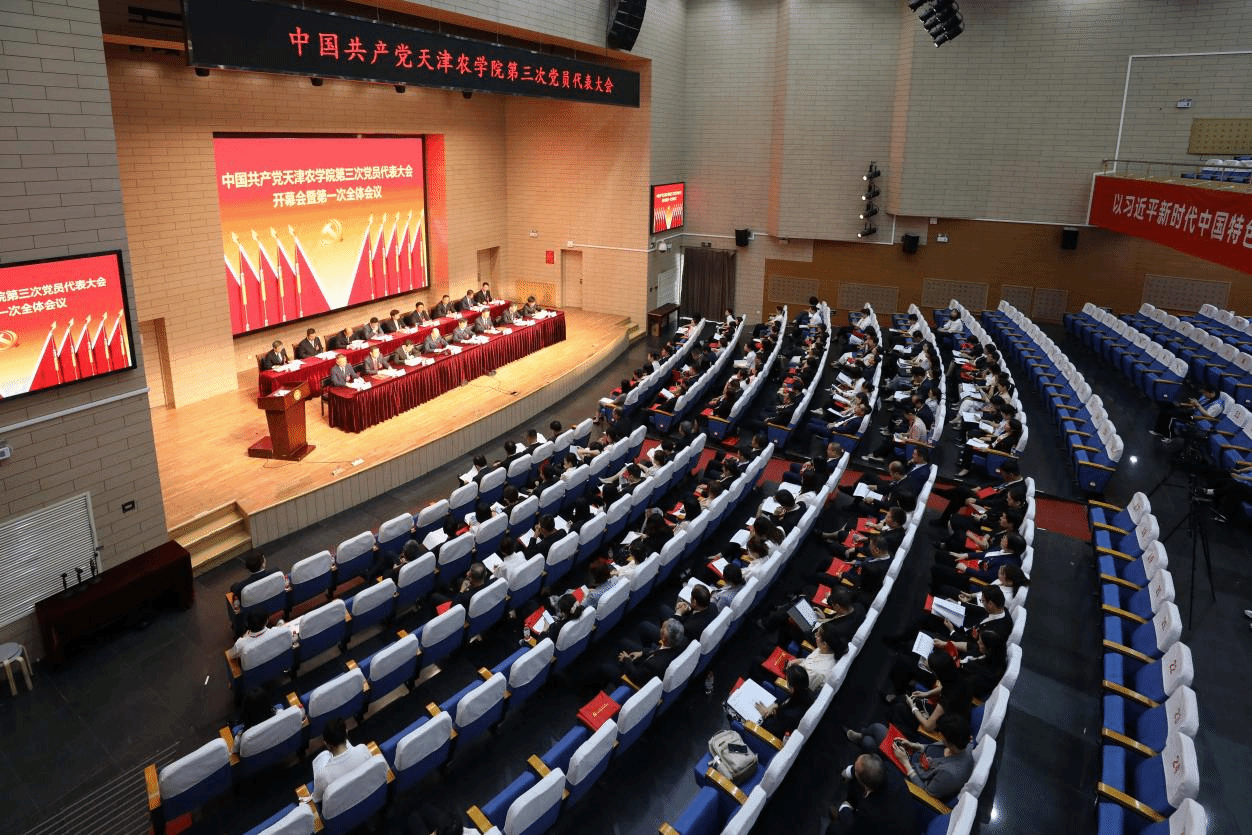 大会会场雄伟庄严、气氛热烈。会场悬挂着“以习近平新时代中国特色社会主义思想为指导,全面建成特色鲜明优势突出的高水平农业大学”的标语。