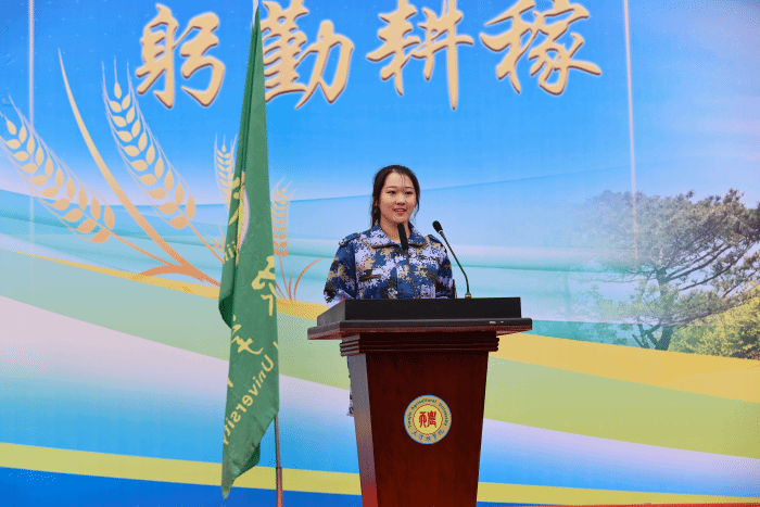 水产学院2022级水产养殖专业本科生赵欣童同学作为在校生代表发言,他分享了在天农的学习与“思源”文化生活经历,并寄语学弟学妹们勇挑重担,厚植家国情怀,练就过硬本领,把所学知识真正用到田间地头,努力成为时代的“发光者”。