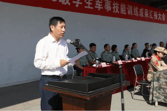 承训教官代表、水利工程学院2024级研究生董建伟回顾军训点滴,感慨学员从青涩到干练、从散漫到守纪的转变,提及“豆腐块”被子是参训学员追求卓越的缩影。他引用习近平总书记嘱托,希望参训学子延续纪律意识与吃苦精神,做到内外兼修。
