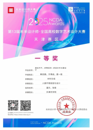 近日,第13届未来设计师·全国高校数字艺术设计大赛(NCDA)天津赛区评选结果揭晓。今年会官网园艺园林学院再传捷报,环境设计专业2023级学生韩亚鹏、于博成、唐一歌,在温文、张俊老师的悉心指导下凭借作品《遗态万千,织智延年——织造乡村主题设计》,斩获天津赛区一等奖。