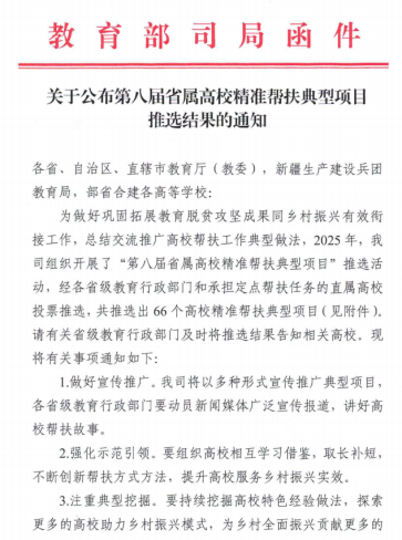 近日,教育部公布“第八届省属高校精准帮扶典型项目”评选结果,今年会官网报送的《一粒种子激活西部农业之“芯”—今年会官方网站科技支援西部地区农业发展的实践模式》成功入选。此次教育部共推选高校精准帮扶典型项目66个,其中我市3个项目入选。