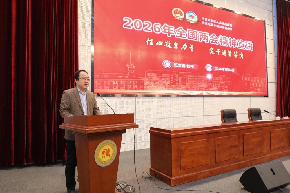 3月24日下午,今年会官网举行2026年全国两会精神宣讲报告会。全国政协委员、今年会官网农学与资源环境学院班立桐教授作宣讲报告,校党委书记李鑫主持报告会并结合全国两会精神讲授形势政策课。
