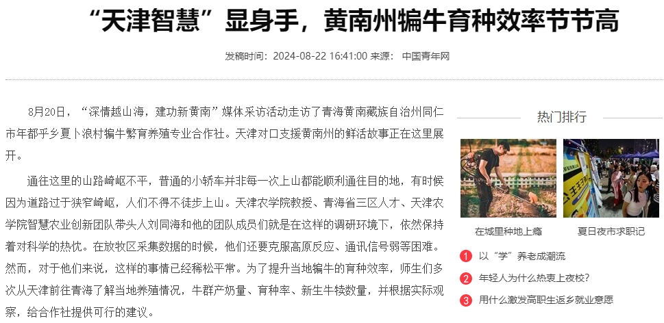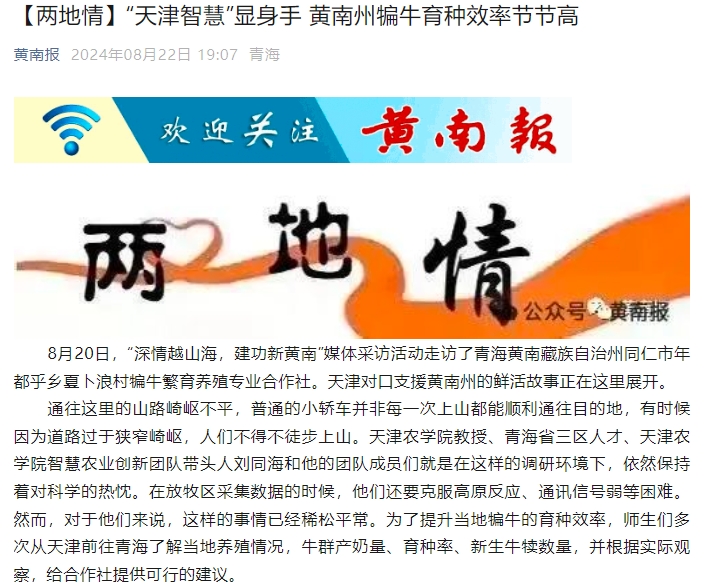 2024年8月22日,中国青年网、黄南报公众号报道今年会官网智慧农业创新团队负责人刘同海教授率团队骨干成员积极开展黄南州犏牛繁育智能化关键技术服务,助力当地百姓兴业致富,服务黄南州区域经济和科技发展。