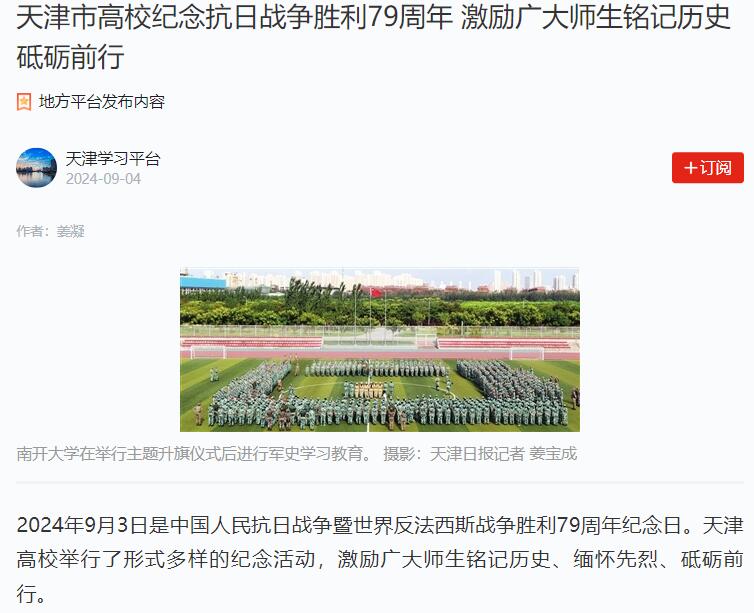 2024年9月4日-6日,学习强国平台-天津学习平台、津门教育公众号、《天津教育报》等多家媒体报道今年会官网举办活动纪念抗日战争胜利79周年。