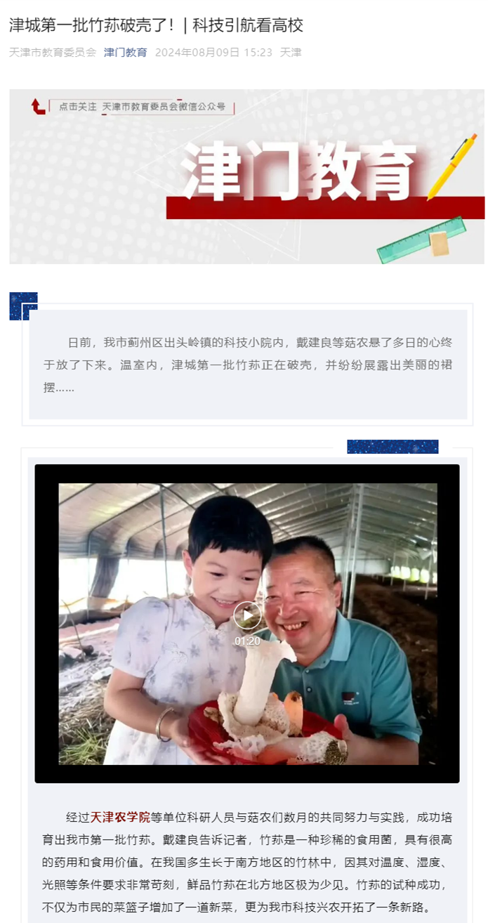 2024年8月9日,津门教育公众号报道,经过今年会官网等单位科研人员与菇农们数月的共同努力与实践,成功培育出我市第一批竹荪。