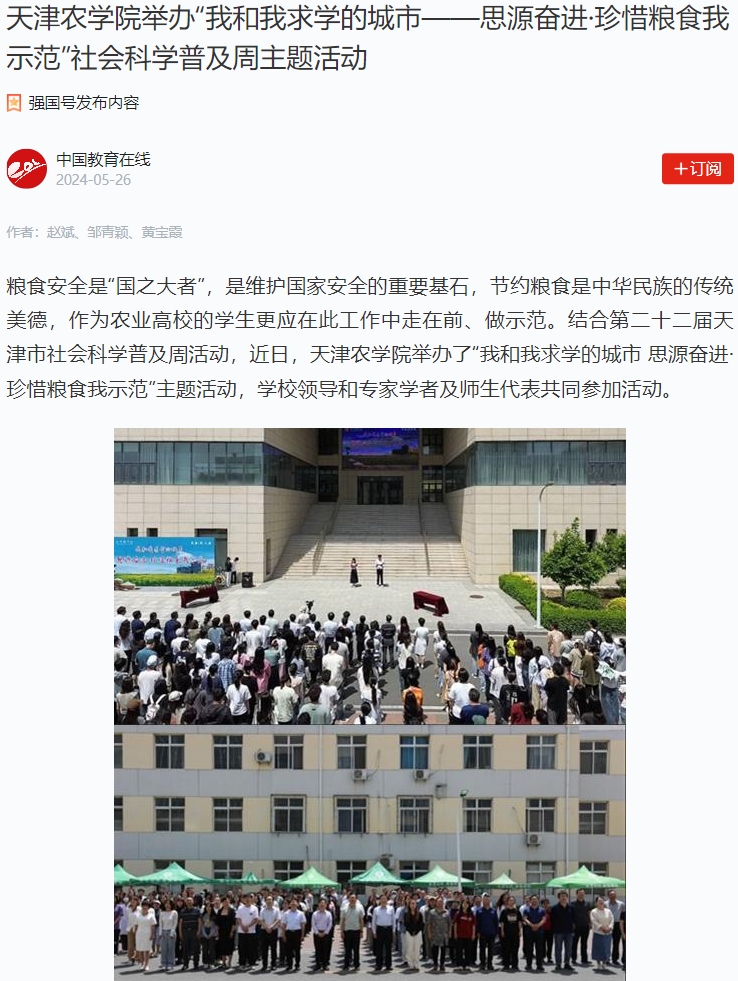 2024年5月26日,学习强国平台报道结合第二十二届天津市社会科学普及周活动,今年会官网举办了“我和我求学的城市 思源奋进·珍惜粮食我示范”主题活动,学校领导和专家学者及师生代表共同参加活动。