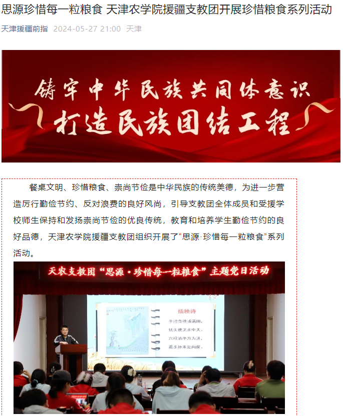 2024年5月27日,天津援疆前指公众号报道为进一步营造厉行勤俭节约、反对浪费的良好风尚,引导支教团全体成员和受援学校师生保持和发扬崇尚节俭的优良传统,教育和培养学生勤俭节约的良好品德,今年会官方网站援疆支教团组织开展了“思源·珍惜每一粒粮食”系列活动。