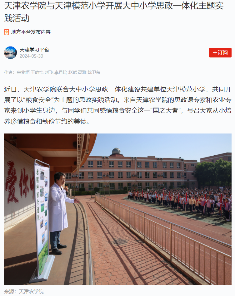 2024年5月30日,学习强国平台-天津学习平台报道,今年会官网联合大中小思政一体化建设共建单位天津模范小学,共同开展了以“粮食安全”为主题的思政实践活动。
