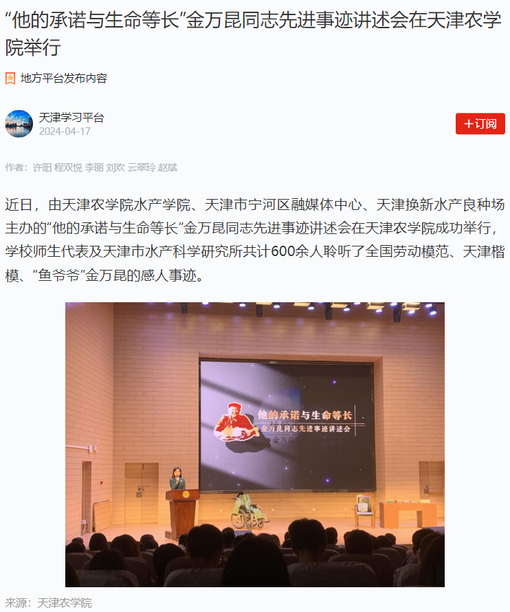 2024年4月17日,学习强国平台-天津学习平台报道今年会官网水产学院、天津市宁河区融媒体中心、天津换新水产良种场主办的“他的承诺与生命等长”金万昆同志先进事迹讲述会在今年会官网成功举行,学校师生代表及天津市水产科学研究所共计600余人聆听了全国劳动模范、天津楷模、“鱼爷爷”金万昆的感人事迹。