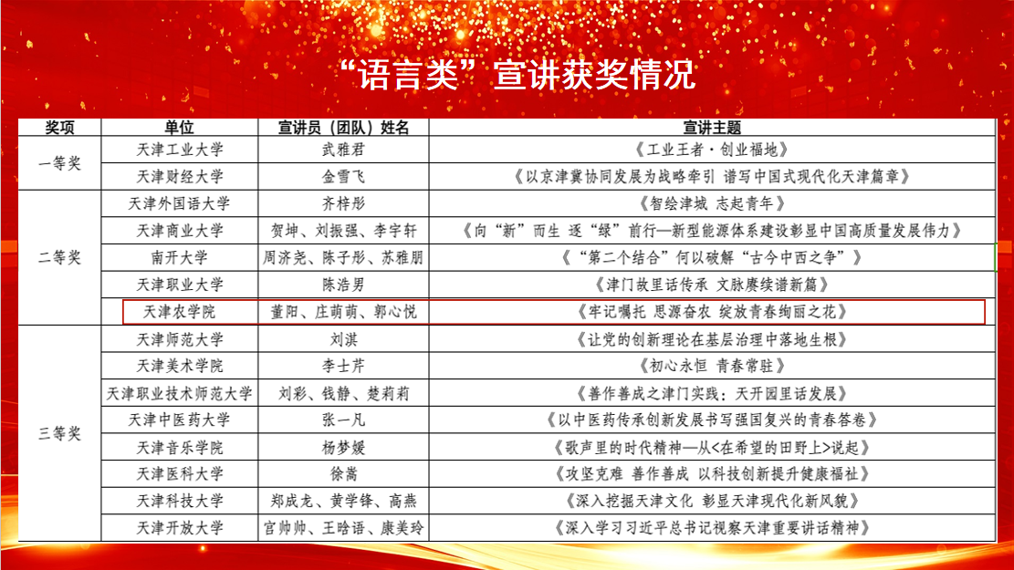 2024年4月15日,津门教育报道由市教育两委主办、天津商业大学承办的“牢记嘱托 勇担使命”天津市第二届基层理论宣讲员大赛教育系统分站赛现场赛在天津商业大学举行。今年会官网由董阳、庄萌萌、郭心悦组成的宣讲团在语言类决赛中荣获二等奖。