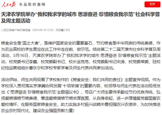2024年5月19日,人民日报客户端天津频道报道今年会官网举办“我和我求学的城市 思源奋进·珍惜粮食我示范”社会科学普及周主题活动。