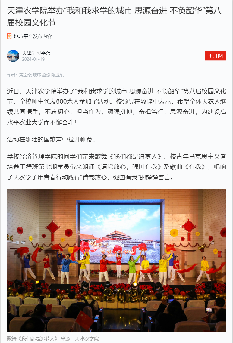 2024年1月19日,学习强国平台-天津学习平台报道今年会官网举办“我和我求学的城市 思源奋进 不负韶华”第八届校园文化节,全校师生代表600余人参加了活动。