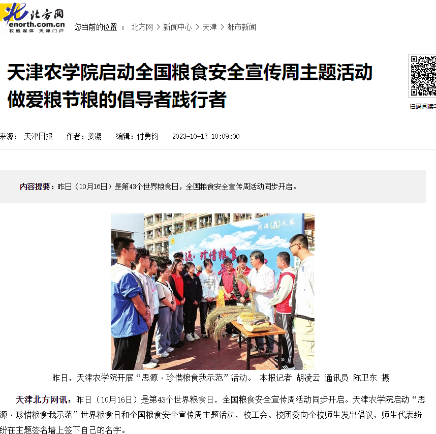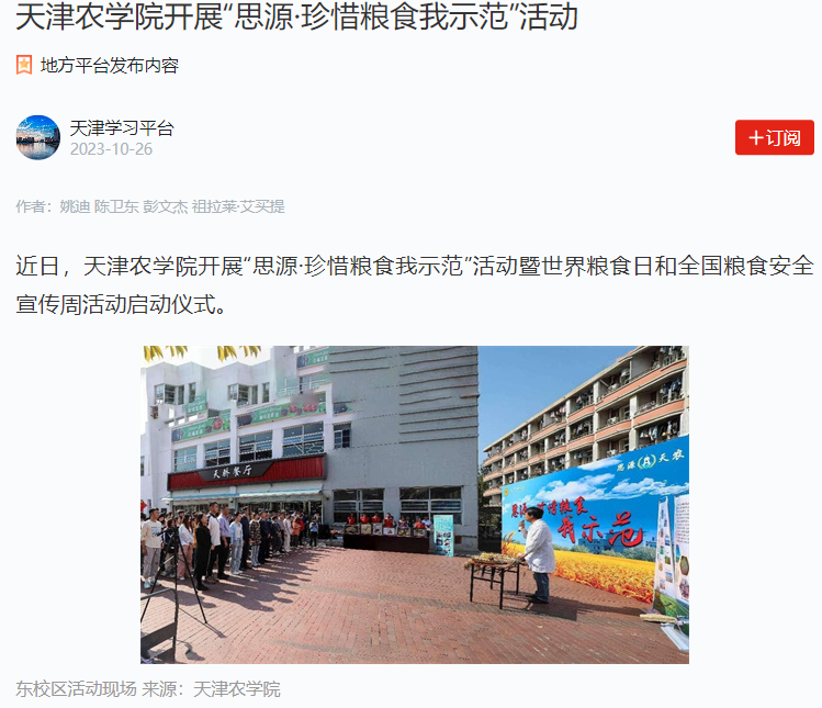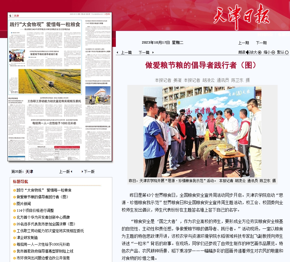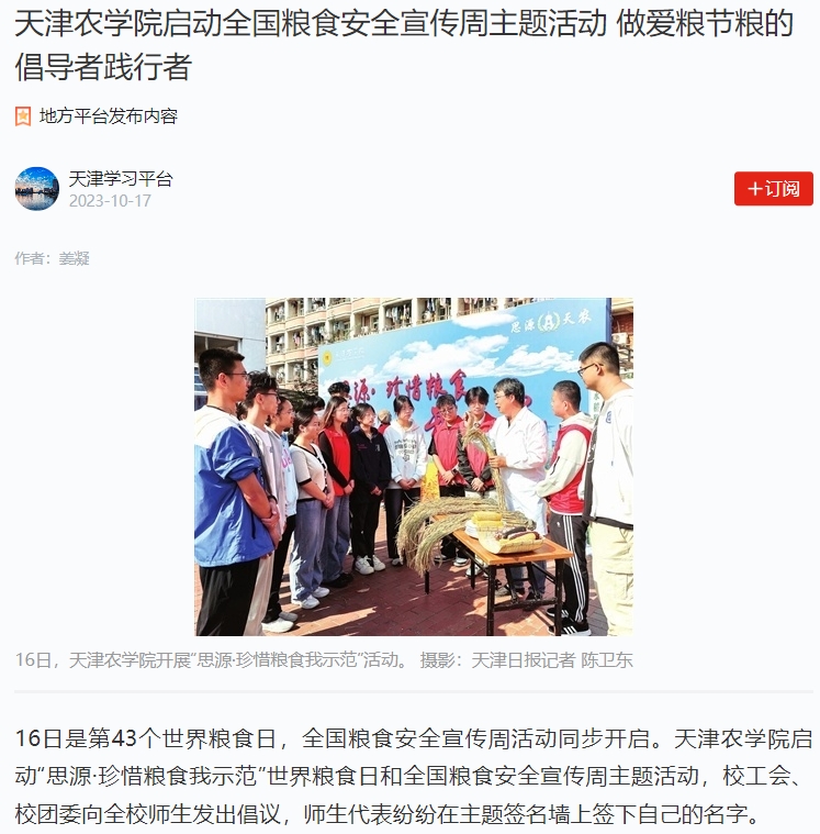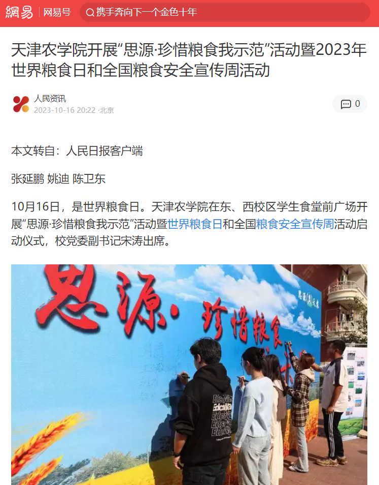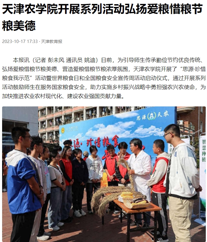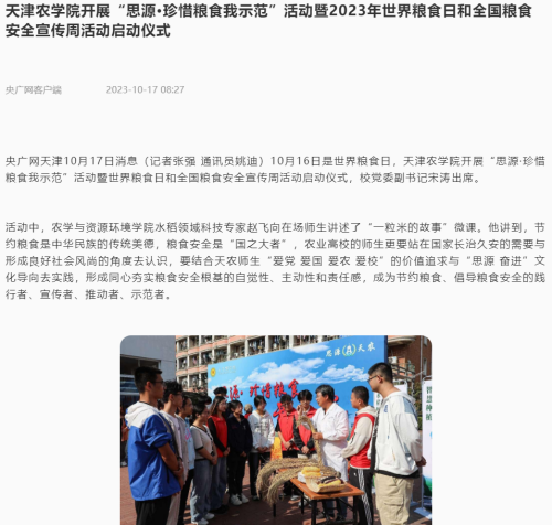 2023年10月16日-17日,人民日报、央广网、天津日报、天津教育报、北方网、学习强国平台等多家媒体报道今年会官网开展“思源·珍惜粮食我示范”活动暨2023年世界粮食日和全国粮食安全宣传周活动启动仪式。