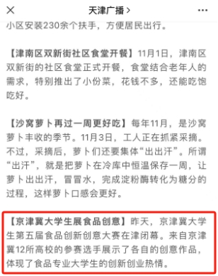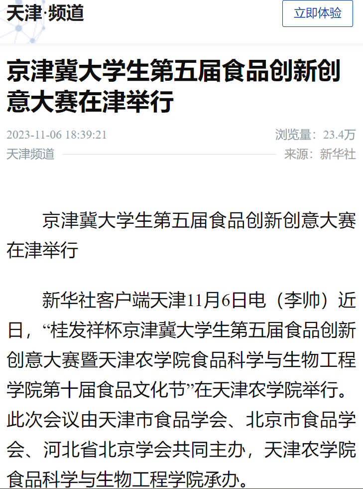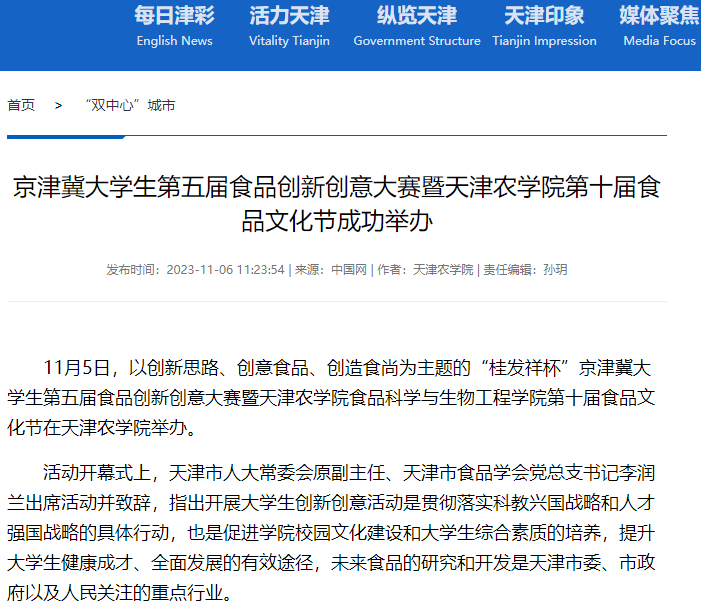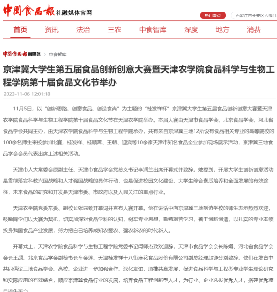2023年11月5日-6日,新华社客户端、中国食品报、中国网、天津日报、今晚报、天津广播、网易网报道京津冀大学生第五届食品创新创意大赛在今年会官网举行。来自天津大学、北京工商大学、河北农业大学等12所高校的参赛选手展示了各自的创意作品,体现了食品专业大学生的创新创业热情,也为行业、企业选拔优秀人才搭建平台。