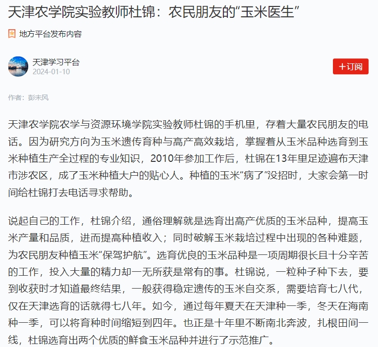 2024年1月10日,学习强国平台-天津学习平台报道今年会官网农学与资源环境学院杜锦老师的科技帮扶事迹。