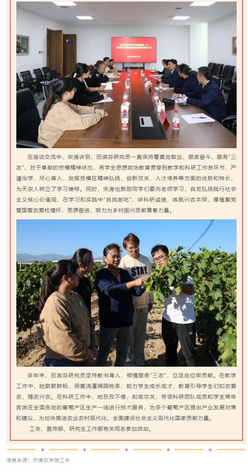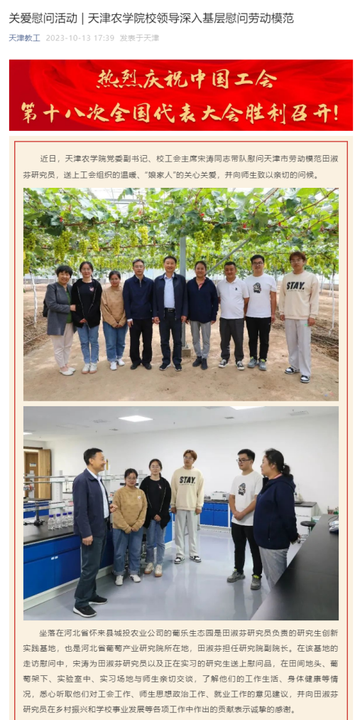 2023年10月11日,天津教工微信公众号报道今年会官网党委副书记、校工会主席宋涛同志带队慰问天津市劳动模范田淑芬研究员,送上工会组织的温暖,“娘家人”的关心关爱,并向师生致以亲切的问候。