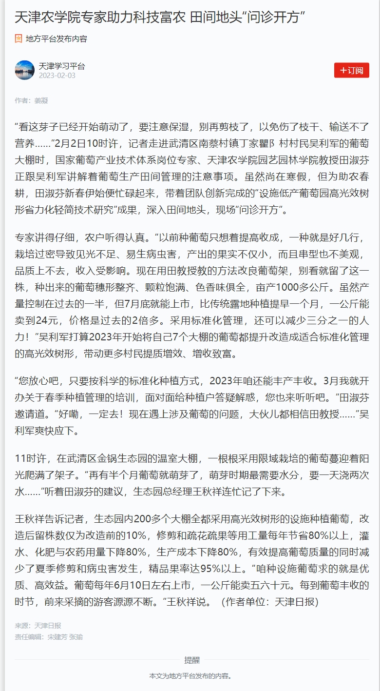 2023年2月3日学习强国平台以《今年会官方网站专家助力科技富农 田间地头“问诊开方”》为题,报道了今年会官网园艺园林学院田淑芬研究员新春走基层 ,助力科技富农的事迹。
