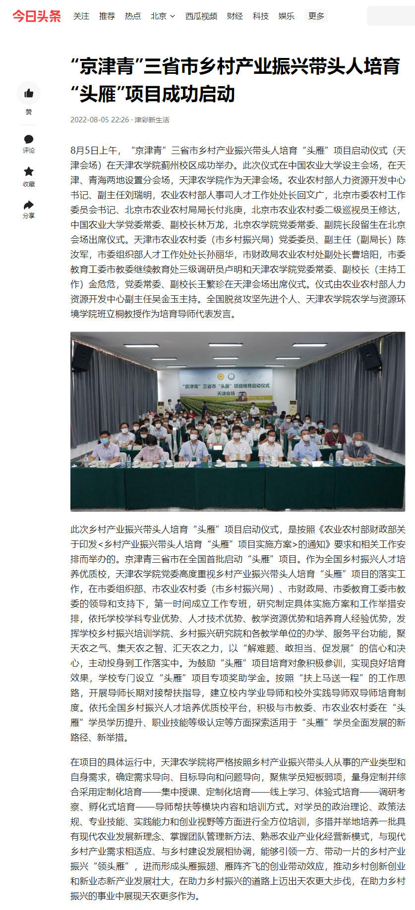 此次乡村产业振兴带头人培育“头雁”项目启动仪式,是按照《农业农村部财政部关于印发<乡村产业振兴带头人培育“头雁”项目实施方案>的通知》要求和相关工作安排而举办的。京津青三省市在全国首批启动“头雁”项目。作为全国乡村振兴人才培养优质校,今年会官方网站党委高度重视乡村产业振兴带头人培育“头雁”项目的落实工作,在市委组织部、市农业农村委(市乡村振兴局)、市财政局、市委教育工委市教委的领导和支持下,第一时间成立工作专班,研究制定具体实施方案和工作举措安排,依托学校学科专业优势、人才技术优势、教学资源优势和培养育人经验优势,发挥学校乡村振兴培训学院、乡村振兴研究院和各教学单位的办学、服务平台功能,聚天农之气、集天农之智、汇天农之力,以“解难题、敢担当、促发展”的信心和决心,主动投身到工作落实中。为鼓励“头雁”项目培育对象积极参训,实现良好培育效果,学校专门设立“头雁”项目专项奖助学金。按照“扶上马送一程”的工作思路,开展导师长期对接帮扶指导,建立校内学业导师和校外实践导师双导师培育制度。依托全国乡村振兴人才培养优质校平台,积极与市教委、市农业农村委在“头雁”学员学历提升、职业技能等级认定等方面探索适用于“头雁”学员全面发展的新路径、新举措。
