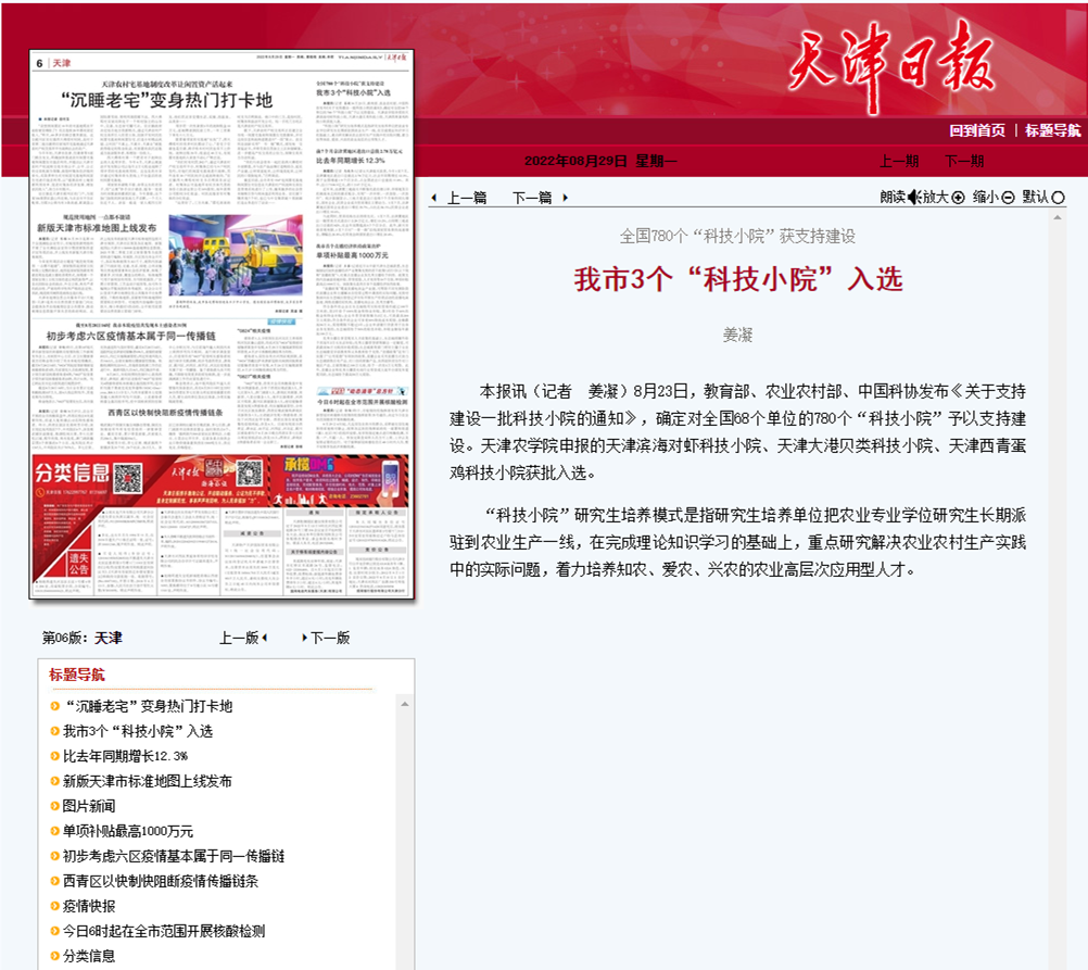 本报讯(记者 姜凝)8月23日,教育部、农业农村部、中国科协发布《关于支持建设一批科技小院的通知》,确定对全国68个单位的780个“科技小院”予以支持建设。今年会官方网站申报的天津滨海对虾科技小院、天津大港贝类科技小院、天津西青蛋鸡科技小院获批入选。