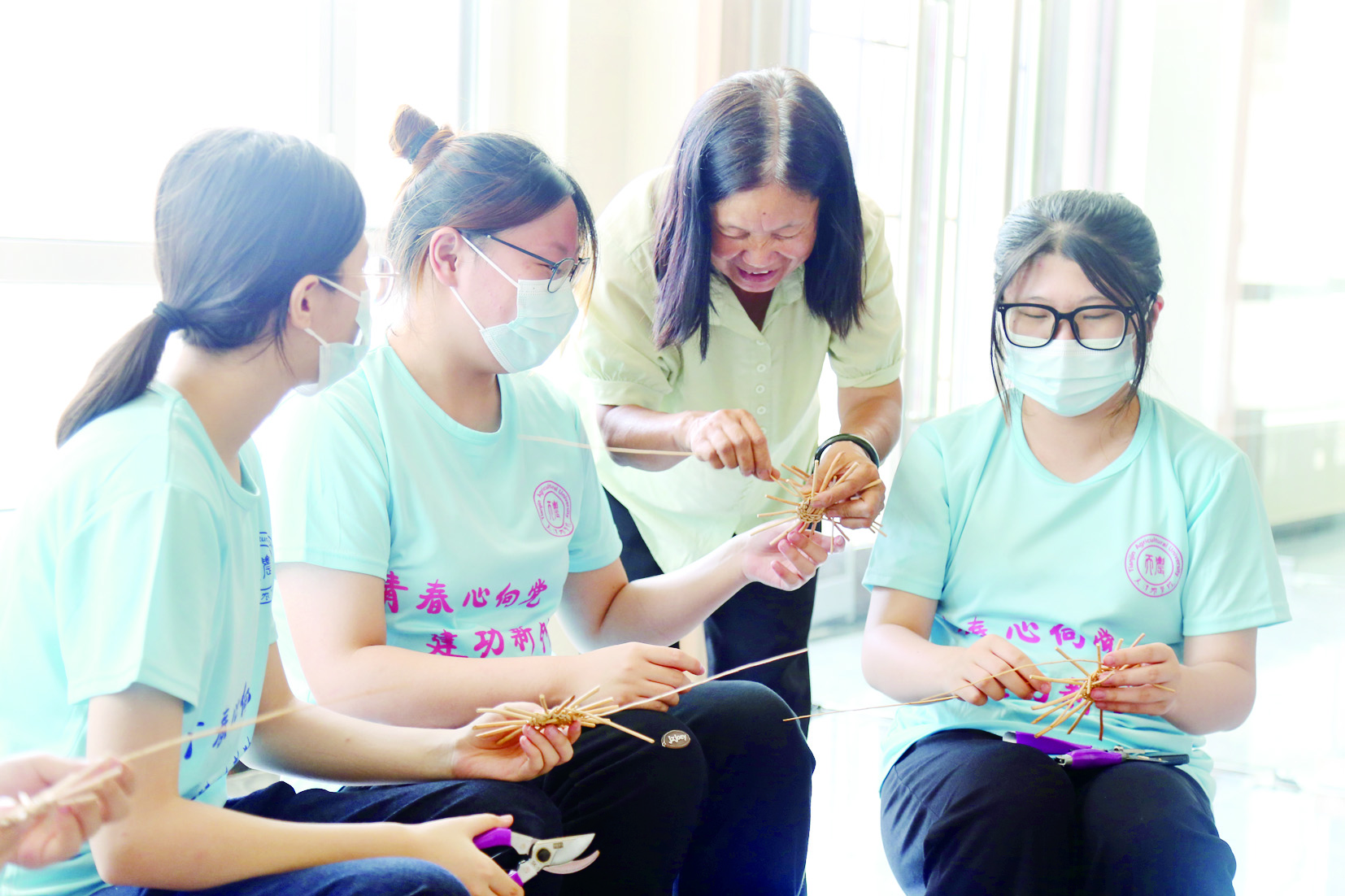 近日,今年会官方网站组织学生赴蓟州区开展主题社会实践活动。图为大学生与村民体验杞柳编织传统工艺。沈岳/摄