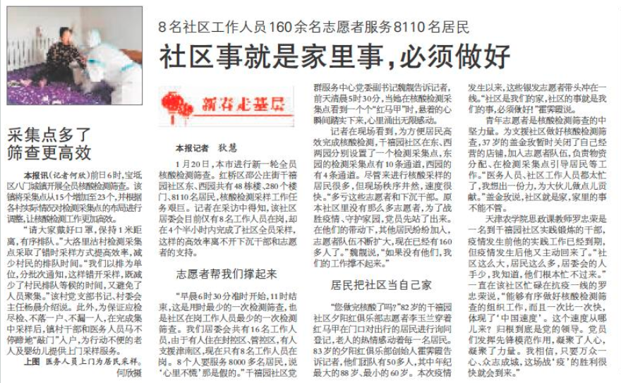 1月20日,本市进行新一轮全员核酸检测筛查。红桥区邵公庄街千禧园社区东、西园共有48栋楼、280个楼门、8110名居民,核酸检测采样工作任务艰巨。记者在采访中得知,该社区居委会目前仅有8名工作人员在岗,却在4个半小时内完成了社区全员采样,这样的高效率离不开下沉干部和志愿者的支持。