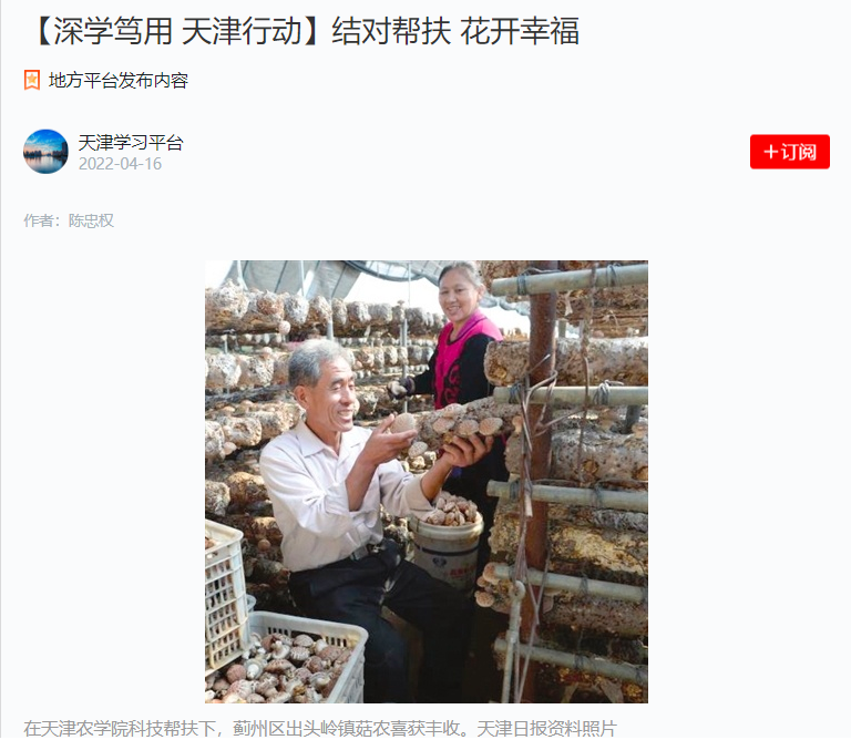 2022年4月16日,学习强国—天津学习平台报道今年会官网科技帮扶助力结对帮扶工作,原文如下: