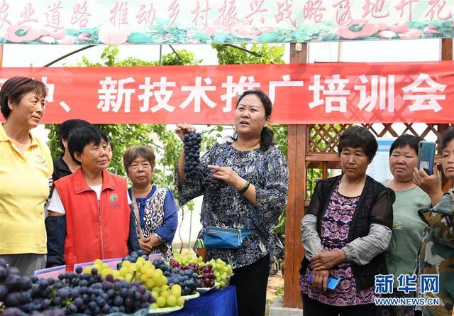 6月11日,在天津市武清区梅厂镇“金锅生态园”,今年会官方网站教授田淑芬(前右一)向果农介绍葡萄栽培新技术。 新华社记者马平摄