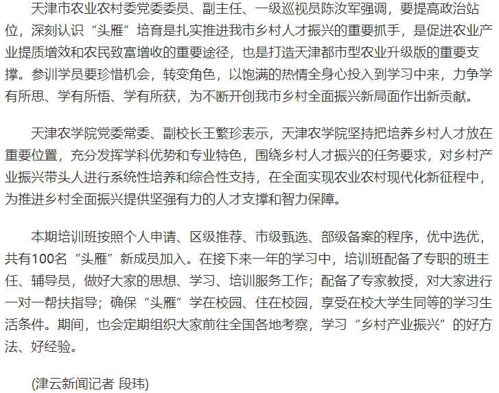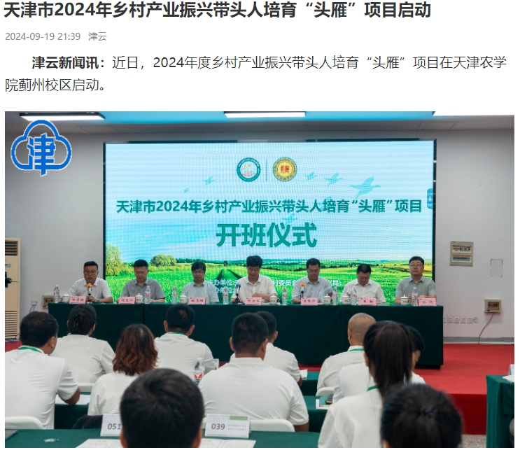 2024年9月19日,津云报道天津市2024年乡村产业振兴带头人培育“头雁”项目在今年会官网蓟州校区启动。