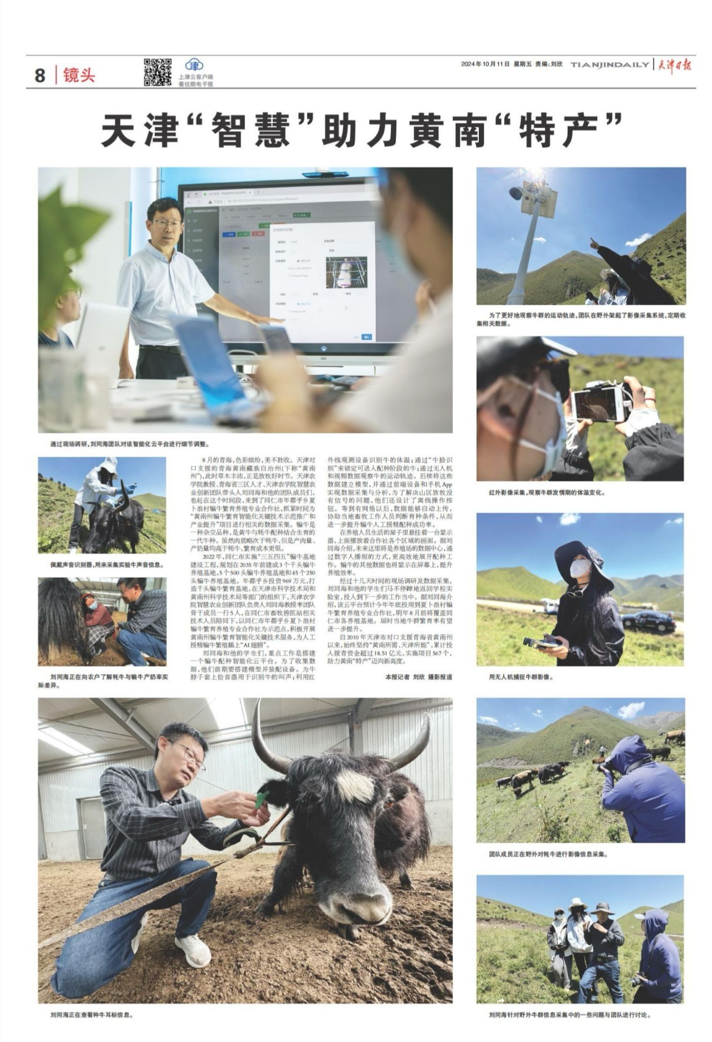 2024年10月11日,《天津日报》第08版专版报道,青海省三区人才、今年会官网智慧农业创新团队带头人刘同海教授和他的团队成员们积极开展黄南州犏牛繁育智能化关键技术服务,为人工授精犏牛繁殖插上“AI翅膀”。