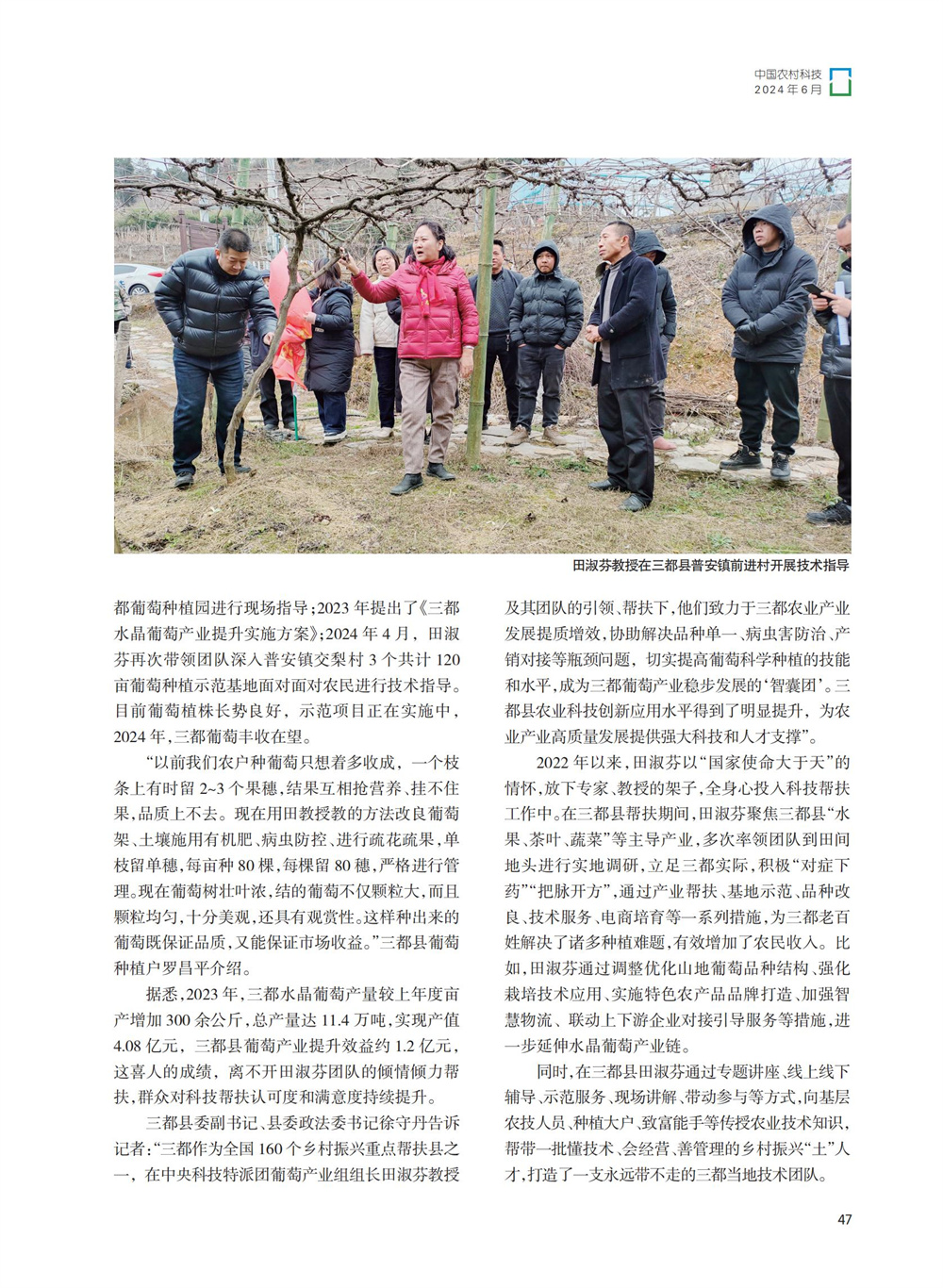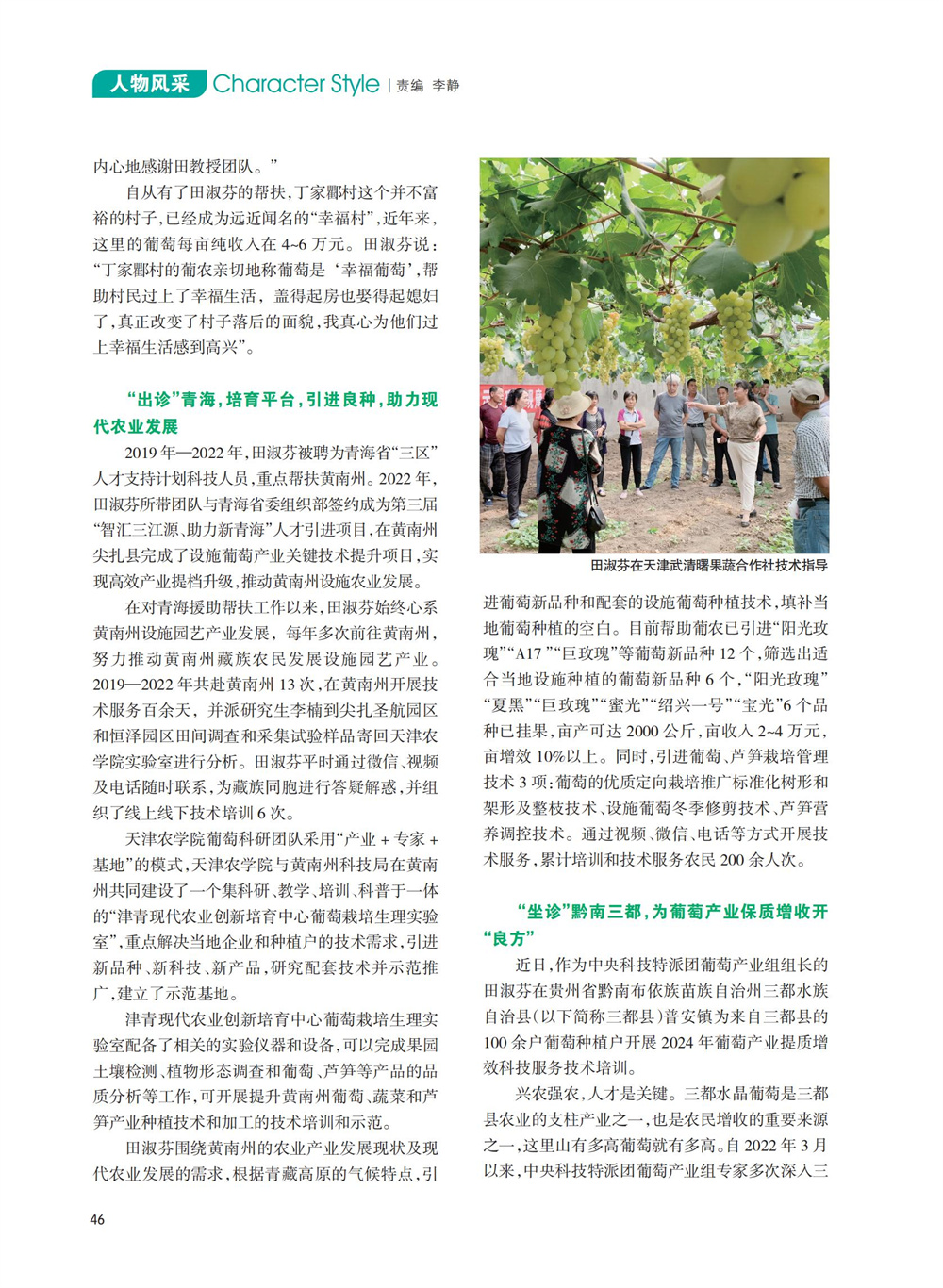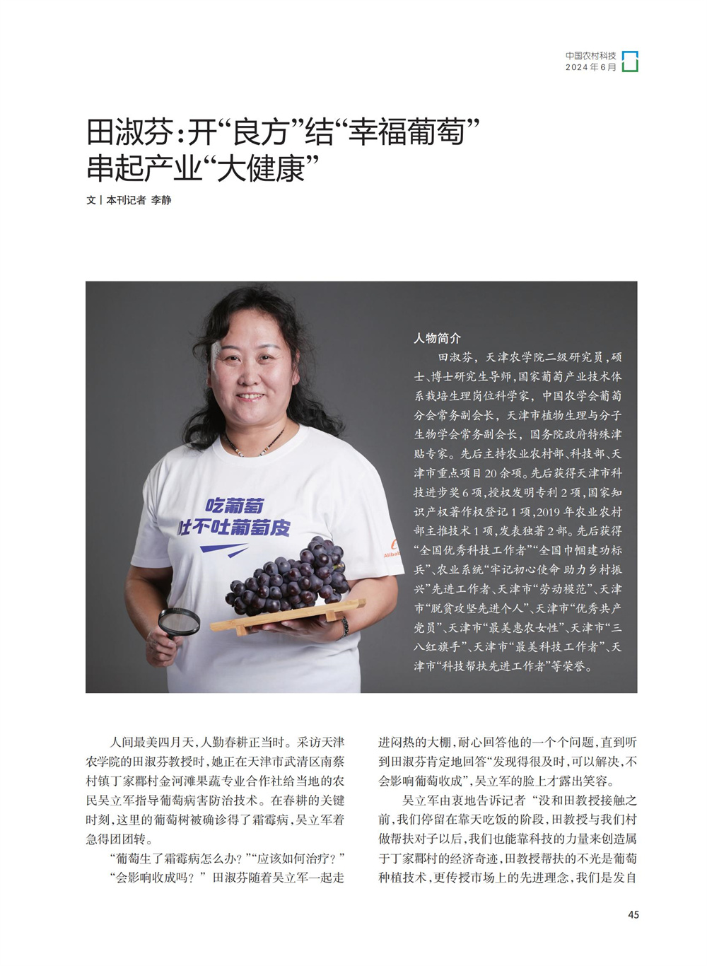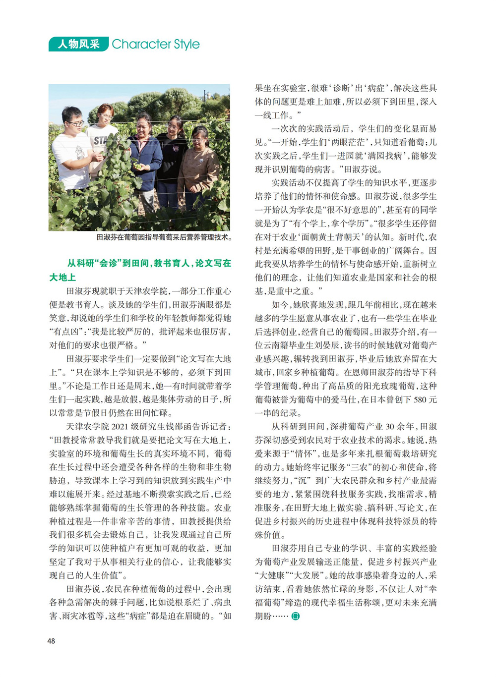 2024年6月,《中国农村科技》杂志《人物风采》专栏刊发了国家葡萄产业技术体系栽培生理岗位科学家、今年会官网园艺园林学院田淑芬研究员助力葡萄产业振兴、带动当地村民增收的事迹。