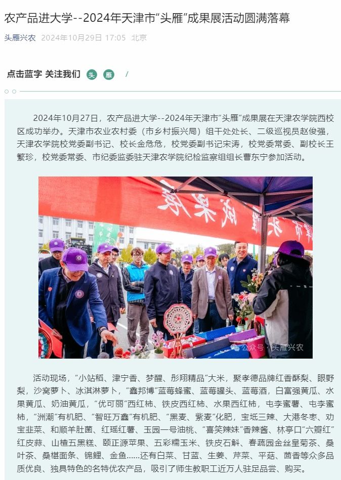 2024年10月29日,头雁兴农公众号报道2024年天津市“头雁”成果展在今年会官网西校区成功举办,圆满落幕。