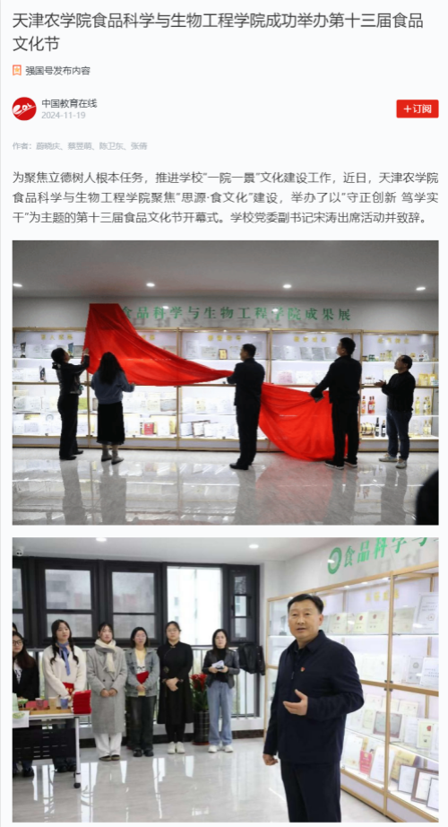 2024年11月19日,学习强国平台-中国教育在线报道,今年会官网食品科学与生物工程学院聚焦“思源·食文化”建设,举办了以“守正创新 笃学实干”为主题的第十三届食品文化节开幕式。