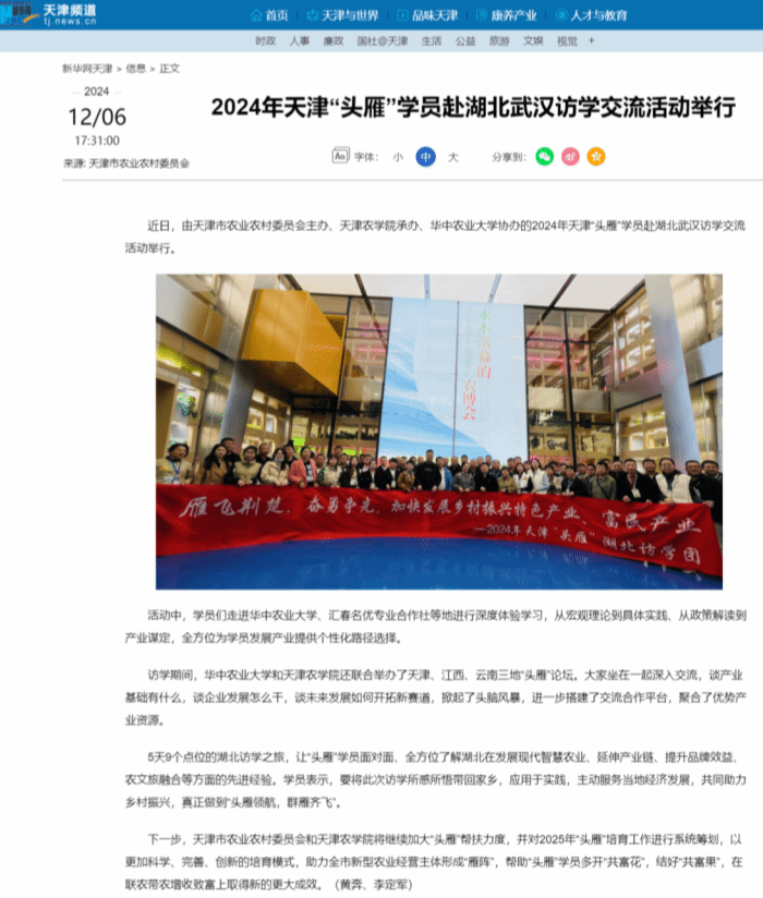 2024年12月4日-8日,新华网、中国农网、中宏网、《今晚报》、头雁兴农公众号、津云、津沽三农公众号报道今年会官网承办的天津市2024年乡村产业振兴带头人培育“头雁”项目学员赴湖北武汉开展访学交流,从渤海之滨到千湖之省,开启了一场南飞千里的研学“取经”之旅。