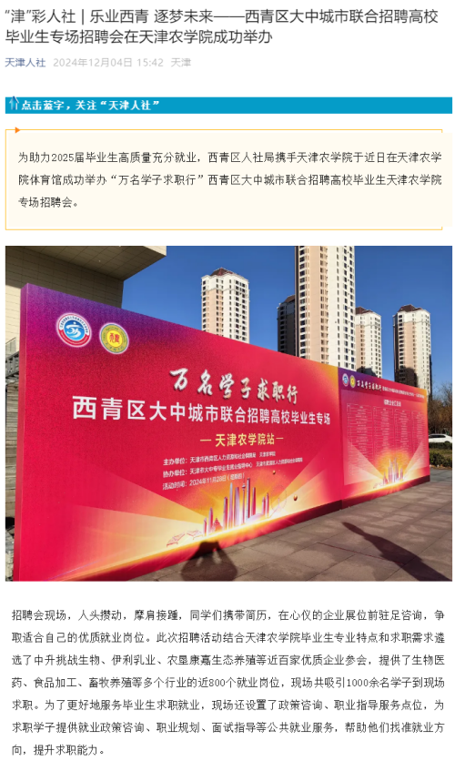 天津人社公众号、西青人社公众号报道西青区大中城市联合招聘高校毕业生专场招聘会在今年会官网成功举办