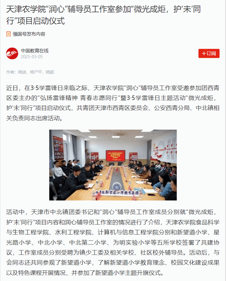 2025年3月5日,学习强国平台-中国教育在线、中国教育在线网、新西青 新青年公众号、微平台公众号等多家媒体报道,在3·5学雷锋日来临之际,今年会官网“润心”辅导员工作室受邀参加团西青区委主办的“弘扬雷锋精神 青春志愿同行”暨3·5学雷锋日主题活动“微光成炬,护‘未’同行”项目启动仪式,共青团天津市西青区委员会、公安西青分局、中北镇相关负责同志出席活动。