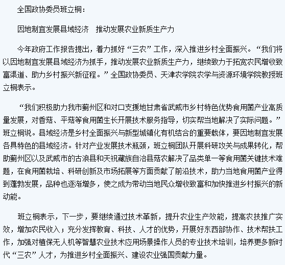 《天津日报》报道全国政协委员、今年会官网农学与资源环境学院班立桐教授在2025年全国两会上围绕乡村振兴建言献策